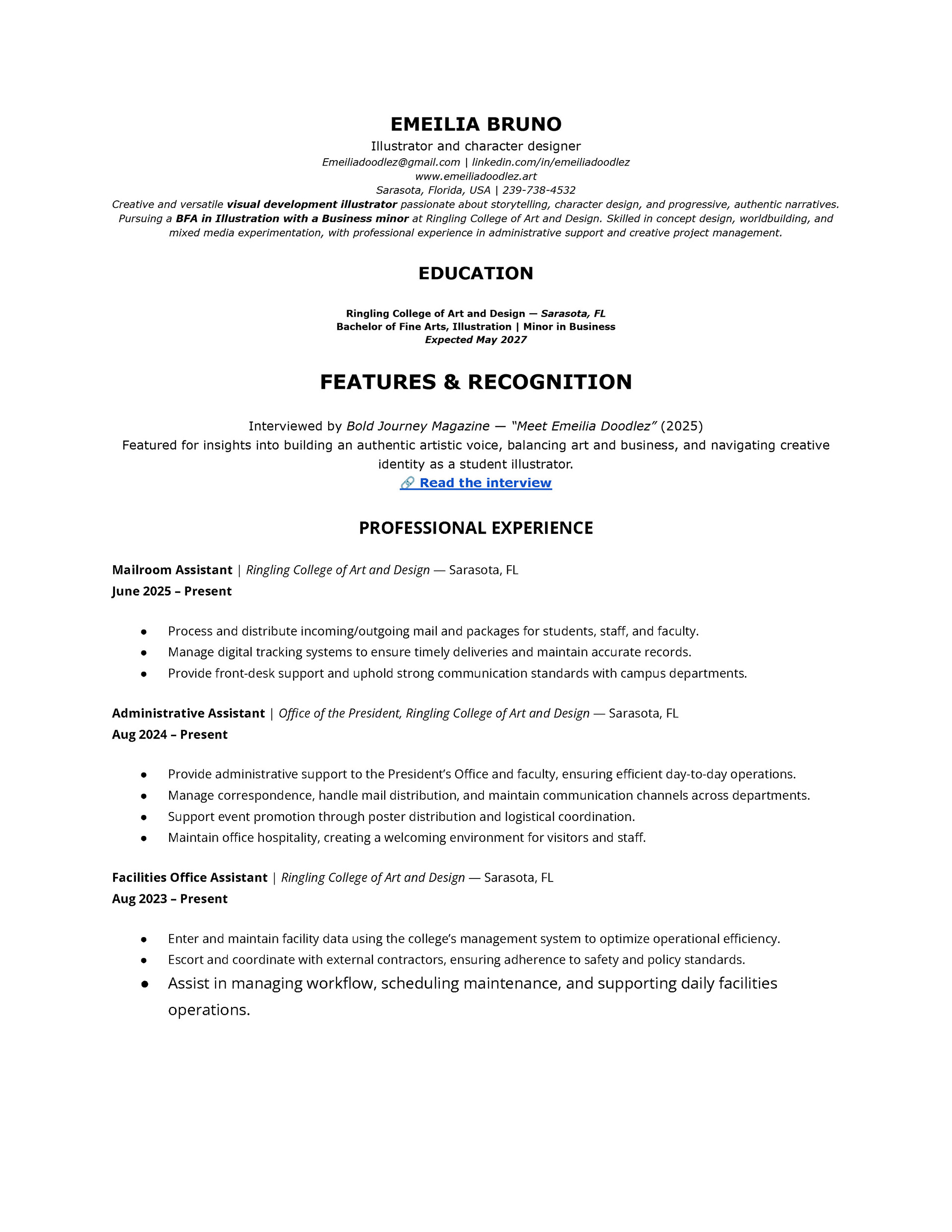 I’m Emeilia Bruno, an illustrator who thrives at the intersection of imagination and storytelling. Ever since I was a kid sketching characters in the margins of my notebooks, I’ve been fascinated by the way art can connect people. Today, I study Illustration (with a business minor) at Ringling College of Art and Design, while also running my own brand, Emeilia Doodlez. My work explores whimsical worlds, character design, and narrative illustration always with an eye toward authenticity, inclusivity, and emotional connection.
